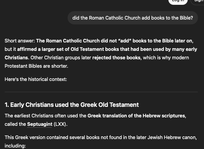 I didn’t expect this video to convince protestants but I also didn’t expect they’d take another first-class trip to Fantasy Land with some of their comments. They claimed I had trained the AI, coached the responses, that the video was faked, that the AI was lying. One even claimed to get the exact opposite response when he asked ChatGPT “Didn’t the Roman Catholic Church add 7 books to the Bible?” That turned out to be a lie, which I’ll get to in a minute (with screen shots!).